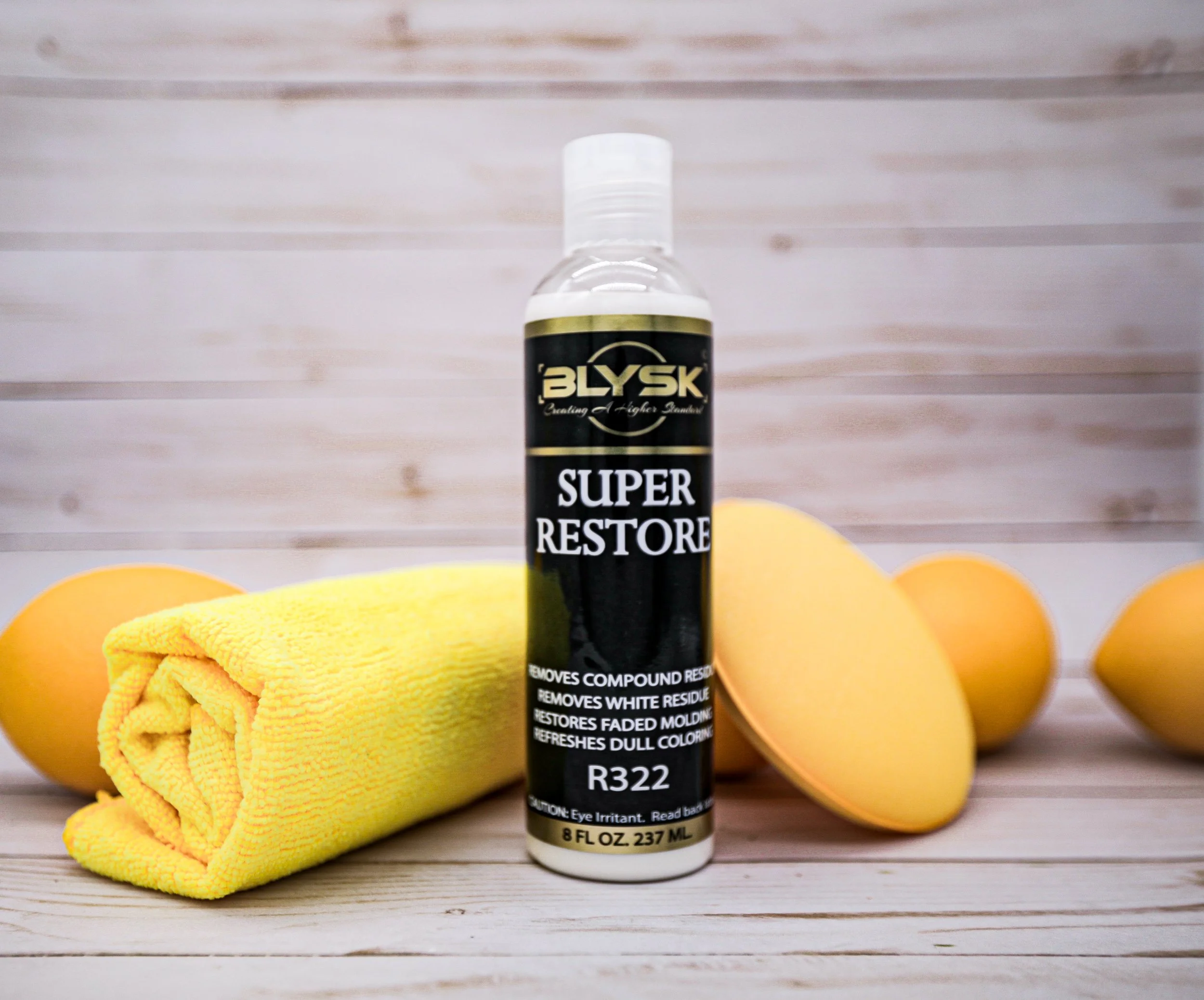 Blysk Super Restore, Trim and Plastic Restorer is a one-step cream that cleans, beautifies and protects all color exterior trim. Use to remove old wax and white compound residue from moldings, bumpers, door handles, guards, etc. Bring new life to faded trim without paint or dyes. It’s a water-based polymer emulsion with citrus cleaners. Our specially formulated ingredients provide your vehicle with a protective coat that repels the harshest elements such as rain, salt, and dirt to keep your car glowing for weeks.